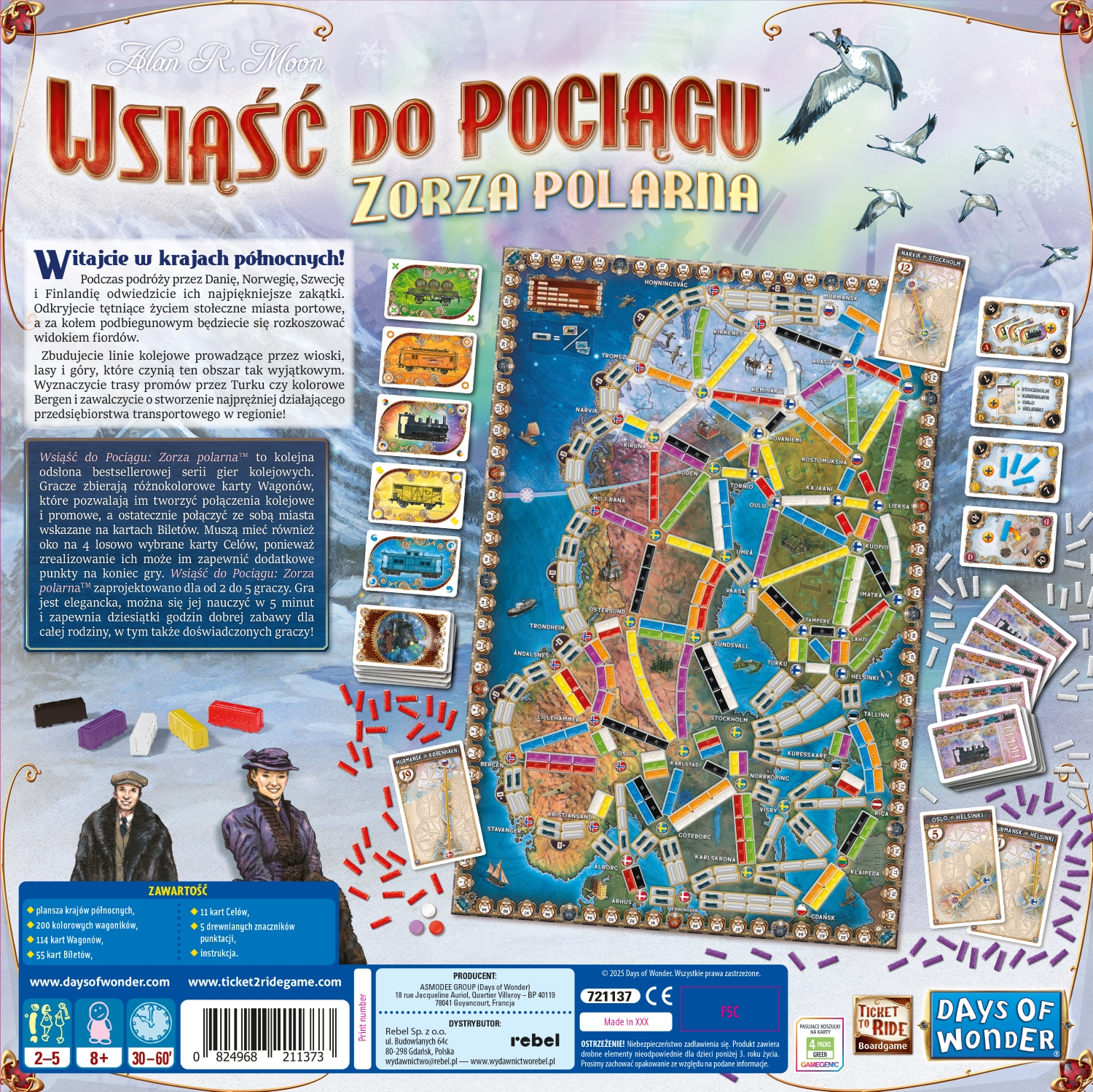 Wsiąść do Pociągu: Zorza polarna to kolejna odsłona bestsellerowej serii gier kolejowych. Gracze zbierają różnokolorowe karty wagonów, które pozwalają im tworzyć połączenia kolejowe i promowe, a ostatecznie połączyć ze sobą miasta wskazane na kartach biletów. Muszą mieć też oko na karty celów, ponieważ zrealizowanie ich może zapewnić dodatkowe punkty na koniec gry!